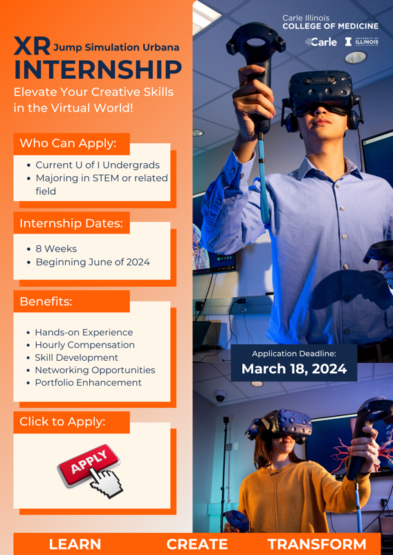 A new Extended Reality (XR) internship opportunity is being offered by the Carle Illinois College of Medicine Jump Simulation Center at the University of Illinois Urbana-Champaign. The unique opportunity will provide Illinois undergraduates access to immersive technologies, virtual reality, and augmented reality.